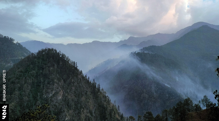 होकरा का जंगल बहुत घना है। घने जंगल के बीच से रास्ता तलाश पाना कठिन था। बड़े-बड़े पेड़ गिरे थे। राहत की बात थी कि यह खूबसूरत जंगल आग से बचा था। जंगल के भीतर वनस्पतियों की काफी विविधता है। बड़े-बड़े फर्न और घने मॉस संकेत दे रहे थे कि यह एक स्वस्थ जंगल है। जैसे-जैसे हम गाँव की तरफ बढ़ते हैं, एक विशाल भू-स्खलन नजर आता है। इसका शिकार हमारा पैदल मार्ग भी हुआ था।