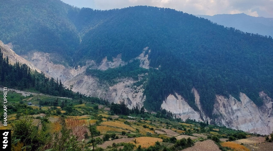 डोर से सैणराथी के रास्ते में एक बड़ा पहाड़ टूटकर गिर रहा है। पूरा रास्ता खतरों से भरा है। इस मार्ग का प्रयोग भी कभी-कभार ही होता होगा। टूटे और फिसलन भरे रास्तों से हम किसी तरह मुख्य गाँव तक पहुंचे। पहले महिलाएं बात करने को तैयार नहीं थीं, फिर इकट्ठा आ गईं। सैणराथी से सक्रिय लैंडस्लाइड अब काफी साफ़ और बड़ा दिखाई देने लगा। हर बारिश में यह बड़ा होता जा रहा है। इसने नीचे तलहटी में स्थित घराट को भी ध्वस्त कर दिया है। गाँव वालों का कहना था कि यह टूटता पहाड़ उन्हें निराशा से भर देता है। सैणराथी गाँव के मध्य भी जमीन धँस रही है। गांव के तीन तरफ लैंडस्लाइड हो रहा है। गाँव का वजूद खतरे में है।