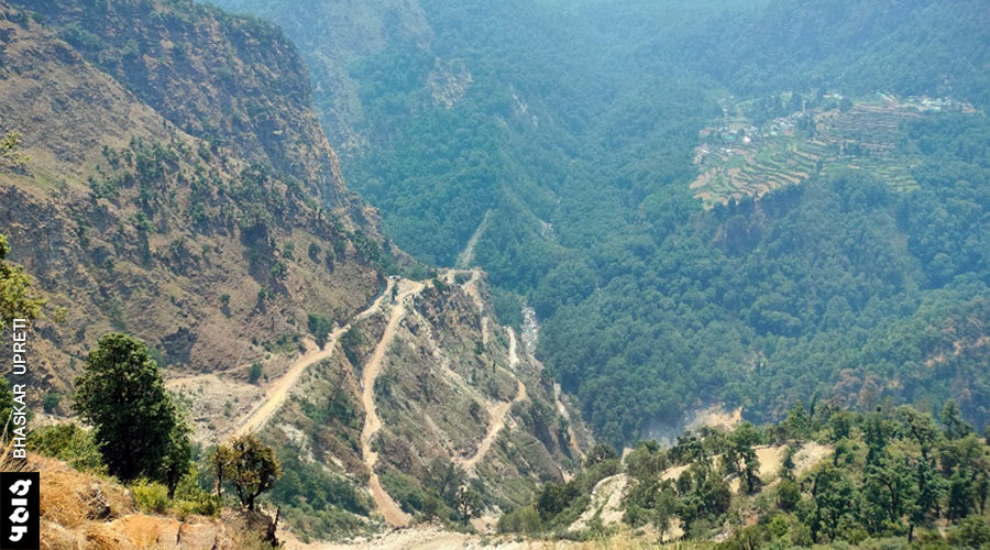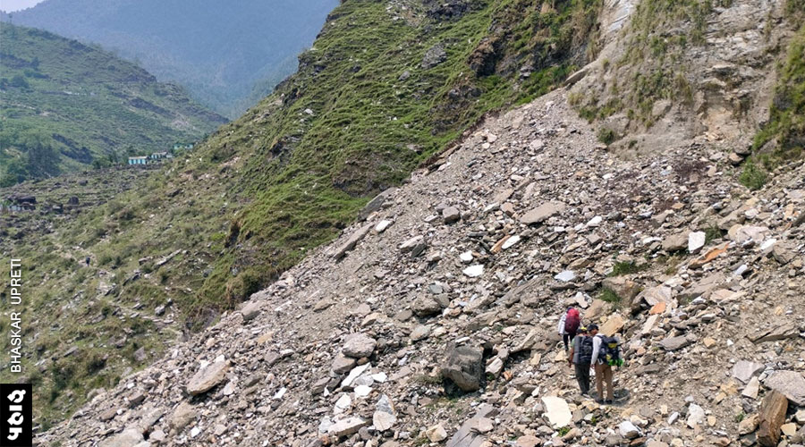 गाँव के ठीक ऊपर तक सड़क पहुँच गई थी। इसी सड़क को गेरी से आ रही सड़क से जुड़ना था। पुल का काम चल रहा था। हम गाँव से ऊपर की ओर बढ़े तो आशंका हुई कि कहीं हमारा मार्ग मलवे की चपेट में तो नहीं आ गया। इसी बीच घाट से आए शिक्षक साथी सोहन के एक परिचित कुँवर सिंह नेगी रास्ते में मिल गए। वह किसी दूसरे गाँव के थे मगर सड़क बना रहे जेसीबी कर्मियों के लिए भोजन बनाने का काम करते थे। वह आला गाँव में 2014 के अभियान में यात्रा दल से मिल चुके थे। उन्होंने आश्वस्त किया कि पैदल मार्ग का कुछ हिस्सा टूटा है लेकिन हम उससे निकल जाएँ। आधा किलोमीटर ऊपर चढ़े होंगे कि ताजा कटी चट्टानों और मलवे ने भयभीत कर दिया। पुराना रास्ता छोड़ कफ्फर की तरफ से उतरने का असफल प्रयास किया। वापस पुराने रास्ते में आए मगर यहाँ मलवा अभी सैटल ही हो रहा था। दूसरा विकल्प नहीं था। यात्रा को आगे बढ़ाना है तो इन्हीं फिसलती चट्टानों में पैर रखकर ऊपर चढ़ना था। मौत का जो मंजर उन पलों में आँखों में आया, उसका वर्णन संभव नहीं। हमारे साथियों की जेसीबी ड्राईवर से झड़प भी हो गई। मगर, वह किसी बड़े ठेकेदार-नेता का नाम लेने लगा। खैर किसी तरह सड़क पर आ गए तो साँस में साँस आई। दूर कहीं तलहटी में बसे सीक गाँव के खेतों में गिर रहे भारी मलबे को हम देख रहे थे। पुराने को दबना है, आहुति देनी है। विकास होकर रहेगा। यहाँ सड़क पर जगह-जगह जिलेटिन की पेटियाँ बेखौफ पड़ी हुई थीं।