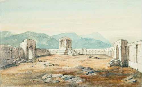 This sheet is the ‘northern’half of a wide panorama Hermann and Adolph Schlagintweit painted simultaneously, back-to-back, during their brief stay at Srinagar. The views of this most famous lake of all India were probably painted for King Friedrich Wilhelm IV of Prussia, whose interest in the lake and the adjacent Shalimar Bagh was certainly known to them. They even possessed (or had photographed?) a small portrait of the princess Nurmahal who perhaps was interpreted as a likeness of the Spontini’s opera heroine.